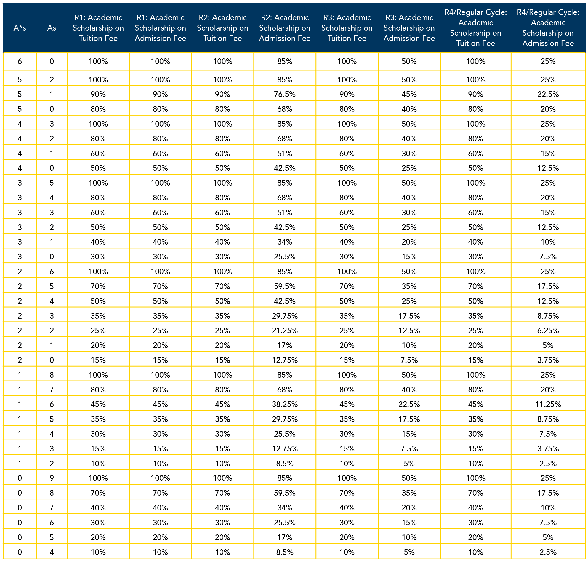 - For students applying during Round 3 the scholarship applied on the admission fee will always be 50% of the scholarship applied on the tuition fee regardless of whether the scholarship is secured at the time of admission and/or secured and/or increased on the basis of the final CAIE O Level results.